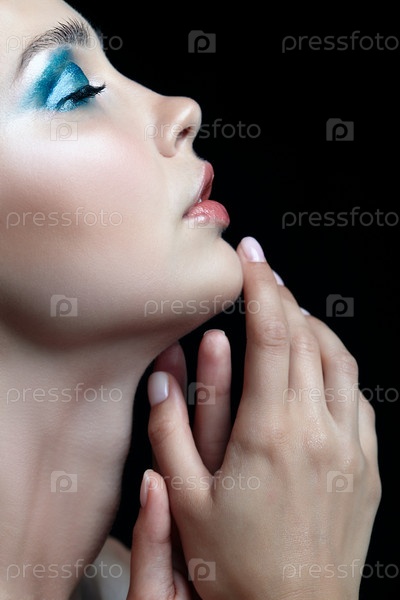 Молодая женщина с идеальной кожей и сине-зелеными дымчатыми тенями для глаз