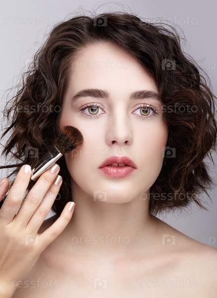 Визажист наносит косметический макияж на лицо красивой девушки