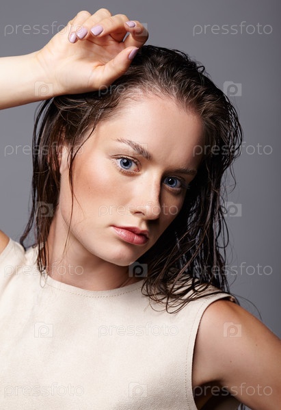 Портрет красоты молодой женщины. Брюнетка с ярко-голубыми глазами и дневным женским макияжем на сером фоне