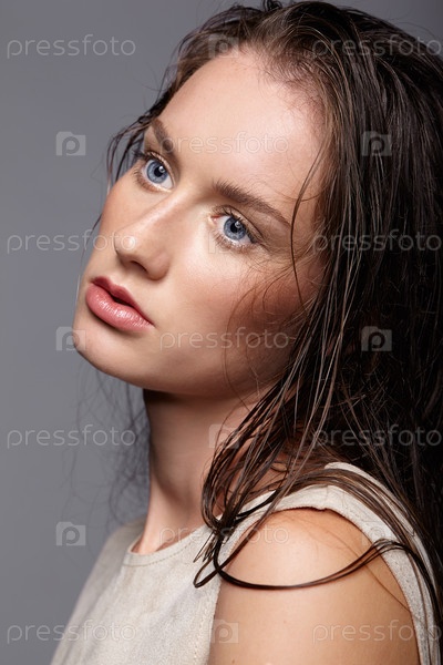 Портрет красоты молодой женщины. Брюнетка с ярко-голубыми глазами и дневным женским макияжем на сером фоне