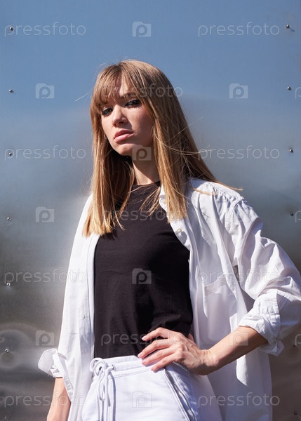 Молодая блондинка. Женская модель позирует на металлическом фоне