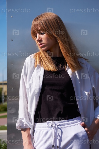 Молодая блондинка. Женская модель позирует на металлическом фоне