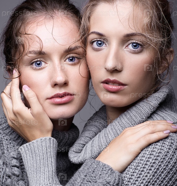 Две молодые женщины в серых свитерах на сером фоне. Красивые девушки протягивают руки в объятиях. Концепция женской дружбы