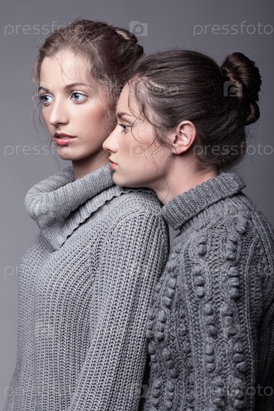 Две молодые женщины в серых свитерах на сером фоне. Красивые девушки протягивают руки в объятиях. Концепция женской дружбы