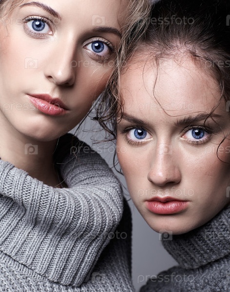Две молодые женщины в серых свитерах на сером фоне. Красивые девушки протягивают руки в объятиях. Концепция женской дружбы