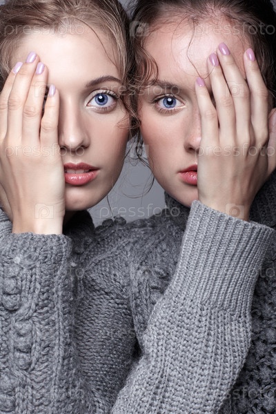 Две молодые женщины в серых свитерах на сером фоне. Красивые девушки протягивают руки в объятиях. Концепция женской дружбы