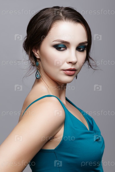 Портрет молодой брюнетки на сером фоне