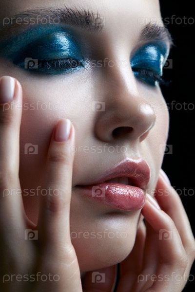 Молодая женщина с идеальной кожей и сине-зелеными дымчатыми тенями для глаз