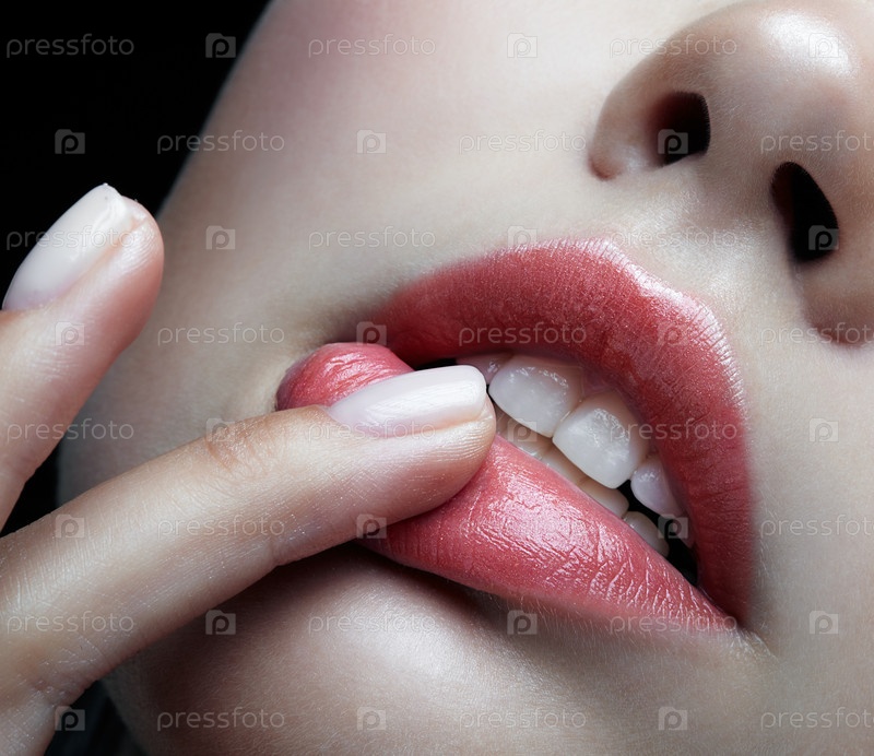 Крупным планом макро портрет женской части лица. Губы человека с дневным макияжем. Девушка с идеальной формой пухлых губ