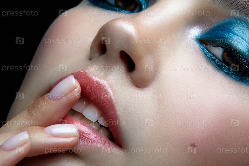 Крупным планом макро портрет женского лица с пальцами на губах. Женщина с вечерним макияжем