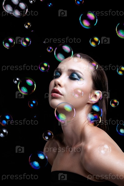 Красивая молодая брюнетка с мыльными пузырями на черном фоне