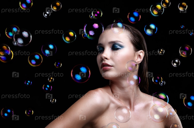 Красивая молодая брюнетка с мыльными пузырями на черном фоне