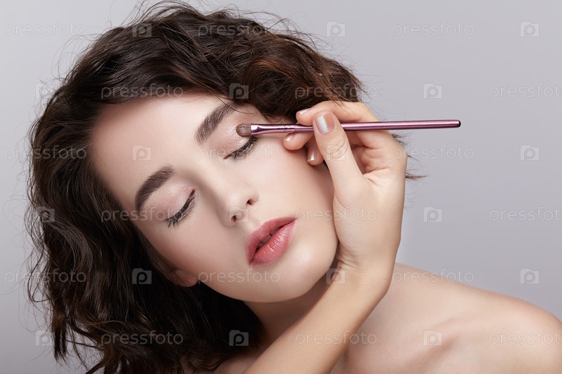Визажист наносит красивый макияж на веки красивой девушки. Визажист с кистью для макияжа в руке