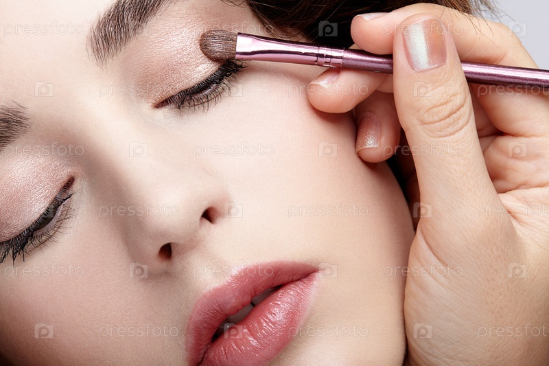 Визажист наносит красивый макияж на веки красивой девушки. Визажист с кистью для макияжа в руке