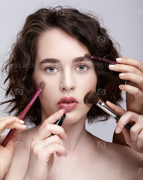 Визажист наносит косметический макияж на лицо красивой девушки. Визажист с кистью для макияжа в руке