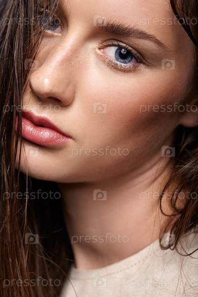 Портрет красоты молодой женщины. Брюнетка с ярко-голубыми глазами и дневным женским макияжем на сером фоне