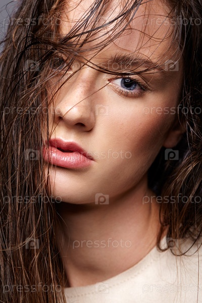 Портрет красоты молодой женщины. Брюнетка с ярко-голубыми глазами и дневным женским макияжем на сером фоне
