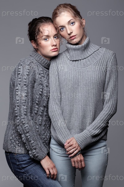 Две молодые женщины в серых свитерах на сером фоне. Красивые девушки протягивают руки в объятиях. Концепция женской дружбы