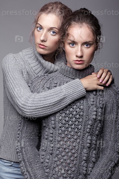 Две молодые женщины в серых свитерах на сером фоне. Красивые девушки протягивают руки в объятиях. Концепция женской дружбы
