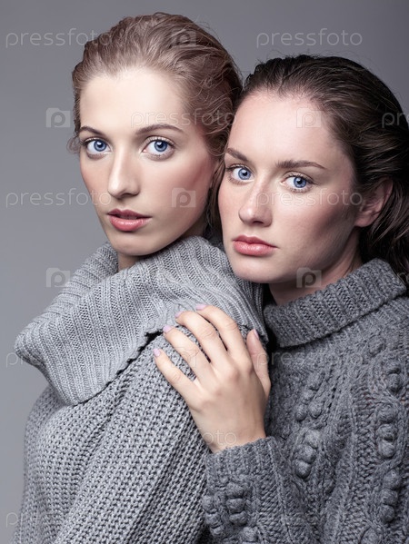 Две молодые женщины в серых свитерах на сером фоне. Красивые девушки протягивают руки в объятиях. Концепция женской дружбы