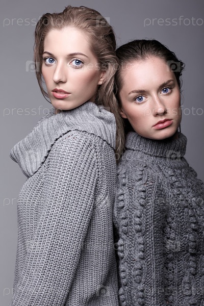 Две молодые женщины в серых свитерах на сером фоне. Красивые девушки протягивают руки в объятиях. Концепция женской дружбы
