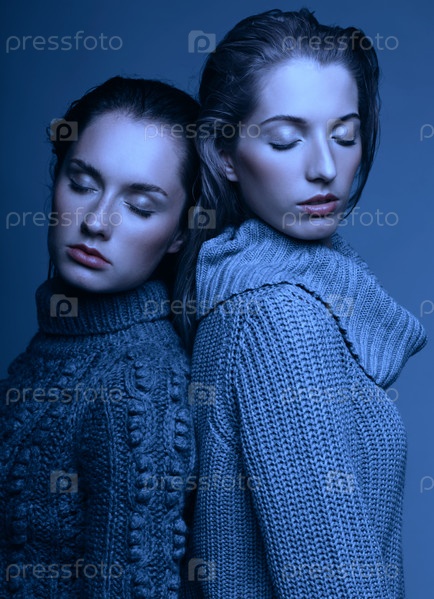 Хэллоуин красота портрет двух молодых женщин в серых свитерах на сером фоне. Красивые девушки протягивают руки в объятиях. Концепция женской дружбы