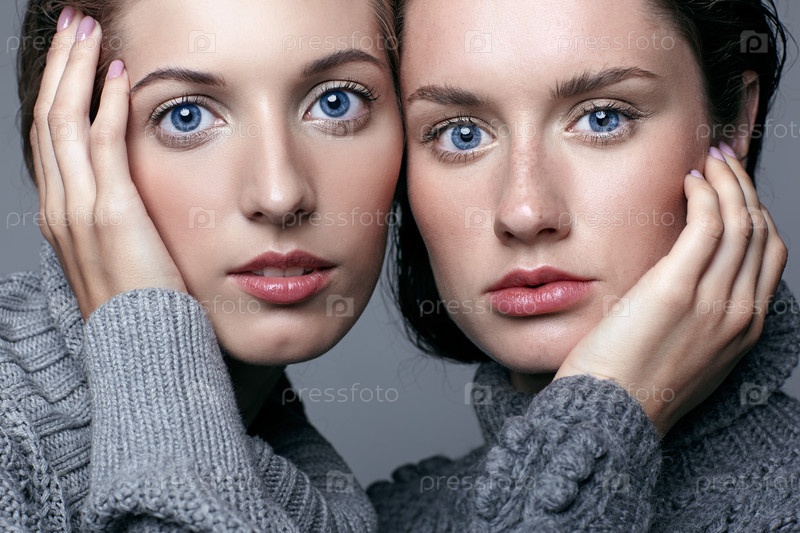 Две молодые женщины в серых свитерах на сером фоне. Красивые девушки протягивают руки в объятиях. Девушки с руками возле лица
