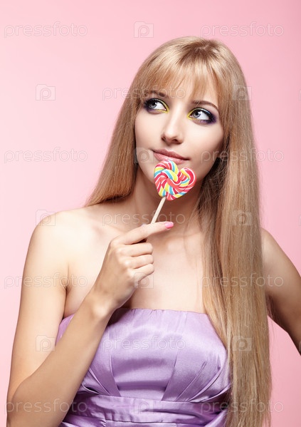Портрет красоты молодой блондинки на розовом фоне. Женщина с леденцом на палочке в руках