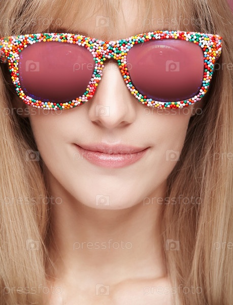 Крупный план портрета молодой блондинки, улыбающейся женщины в веселых конфетных очках