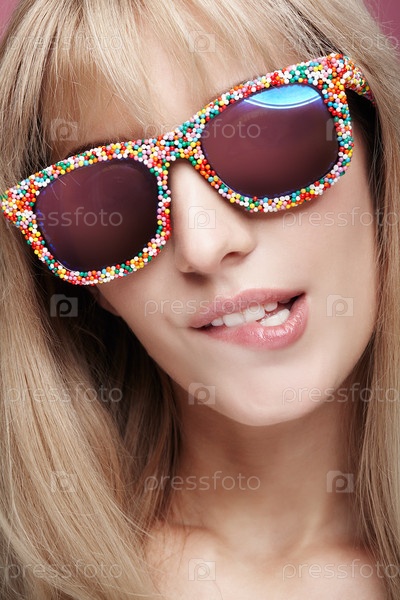 Крупным планом портрет молодой блондинки в забавных конфетных очках кусает губу