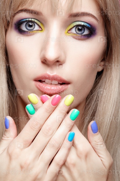 Крупным планом изображение человеческого женского глаза с фиолетовыми тенями, синим и желтым макияжем