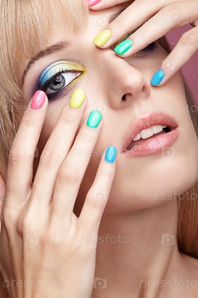 Крупным планом изображение человеческого женского глаза с фиолетовыми тенями, синим и желтым макияжем