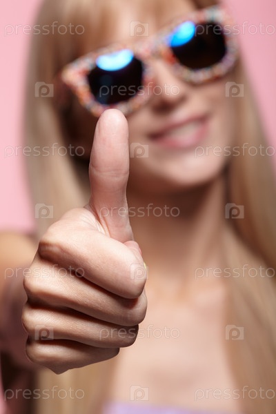Женский портрет с малой глубиной резкости. Молодая белокурая улыбающаяся женщина в забавных конфетных очках и большим пальцем вверх