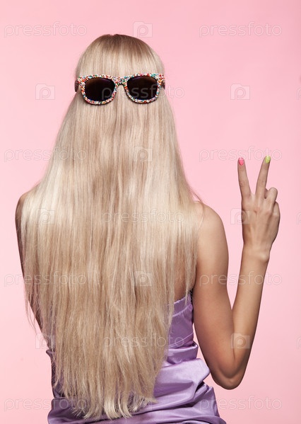 Вид сзади на молодую женщину. Светлые прямые волосы в забавных солнцезащитных очках