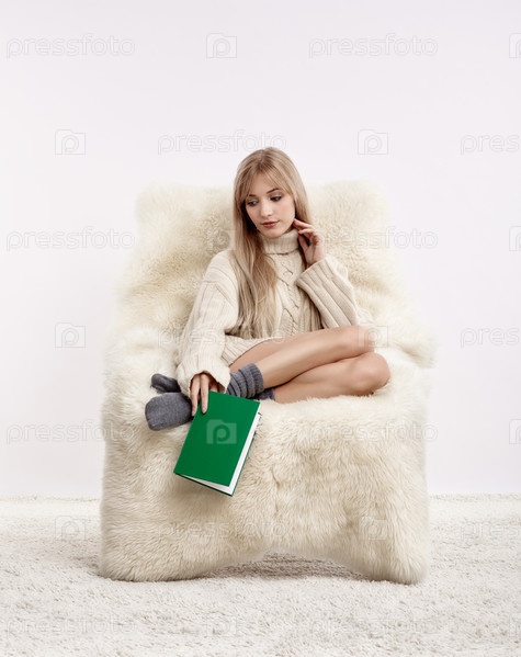 Блондинка на пушистом кресле с книгой в руках