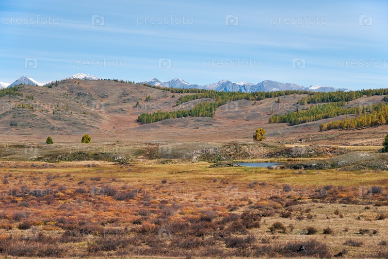 Вид на Алтайское озеро Джангыскол и горное плато Эштыкель. Северо-Чуйский хребет. Россия