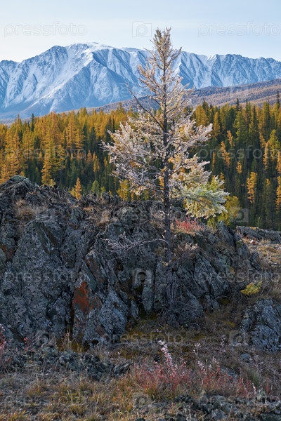 Замороженная лиственница под инеем. На заднем плане - снежные горы Северо-Чуйского хребта