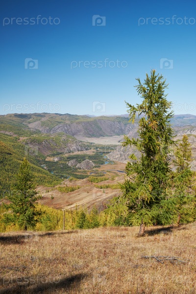 Осенний высокогорный пейзаж. Алтайская река Чуя окружена горами. Алтай, Россия
