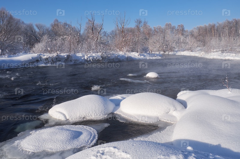 Река Кокша в окружении деревьев под инеем и снегом в Алтайском крае в зимний сезон