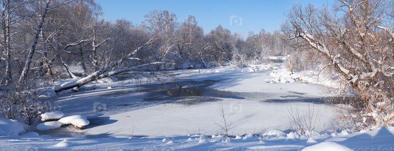 Река Кокша в окружении деревьев под инеем и снегом в Алтайском крае в зимний сезон