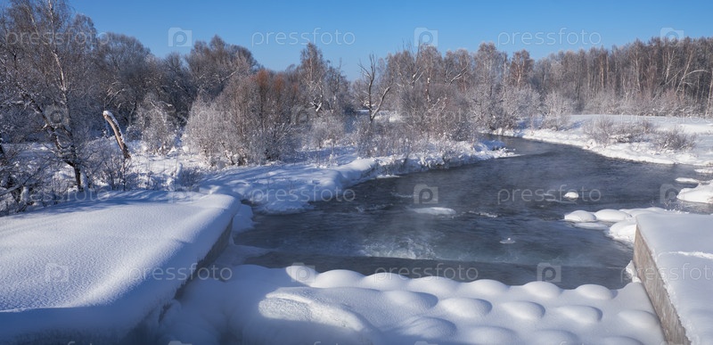 Плотина между прудом Кокши и рекой Кокша в Алтайском крае в зимний период