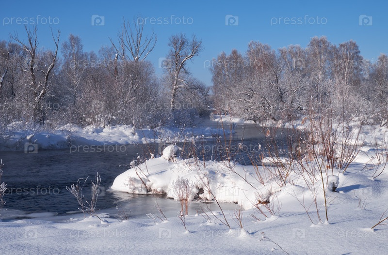 Река Кокша в окружении деревьев под инеем и снегом в Алтайском крае в зимний сезон