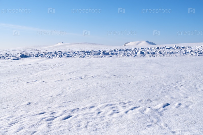 Алтайский равнинный зимний пейзаж со снежным полем под голубым небом