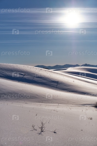 Зимний пейзаж с каблуками под снегом с солнцем на голубом небе