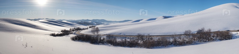 Панорама зимней дороги и деревьев под снегом на Алтае