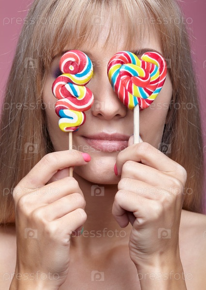 Портрет красоты молодой блондинки на розовом фоне. Женщина с леденцом на палочке в руках
