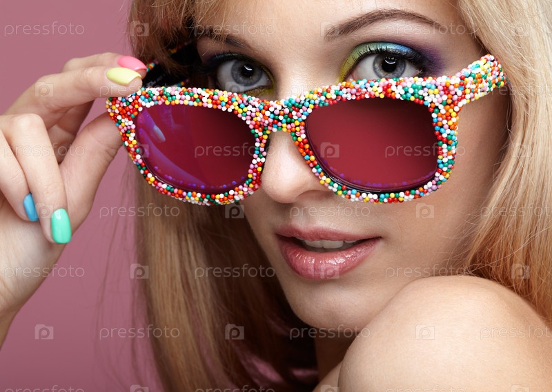 Молодая блондинка серьезная женщина в веселых конфетных очках на розовом фоне