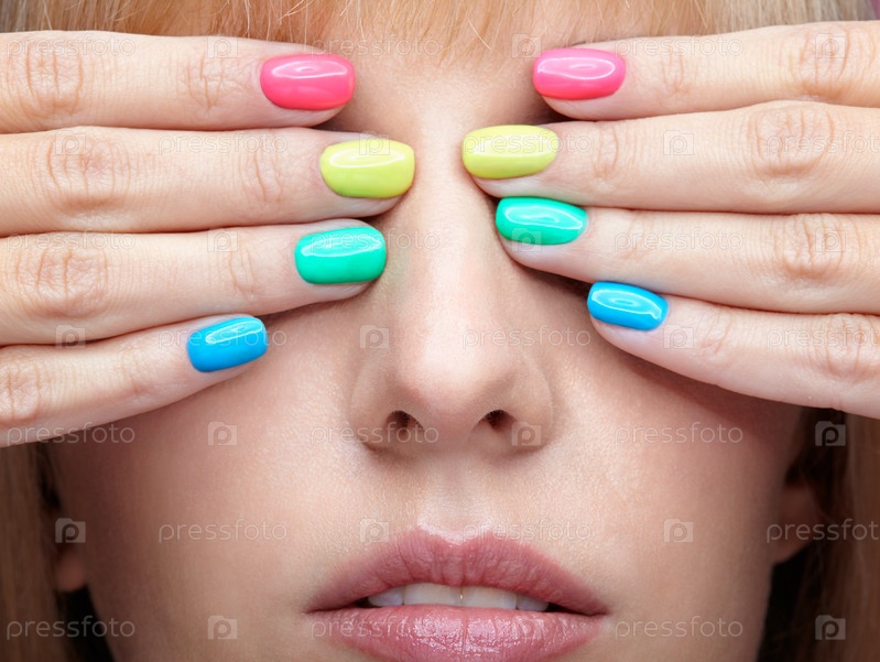Молодая блондинка с забавным разноцветным маникюром ногтей