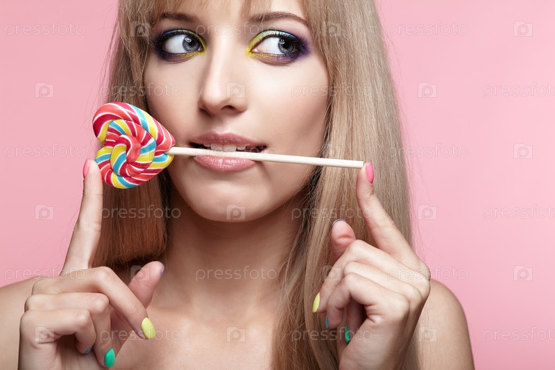 Портрет красоты молодой блондинки на розовом фоне. Женщина с леденцом на палочке в руках