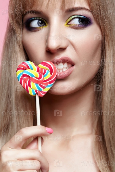 Портрет красоты молодой блондинки на розовом фоне. Женщина с леденцом на палочке в руках